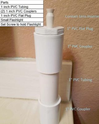A patient of ours is an engineer by trade and a first-time scleral wearer with keratoconus. Like all first-time scleral wearers, it took a little time to get the hang of inserting the lenses, so they did a little research on scleral stands and decided to make their own using PVC tubing and couplers, a light from a flashlight, and a screw (see last image of the slideshow below for a list of parts).